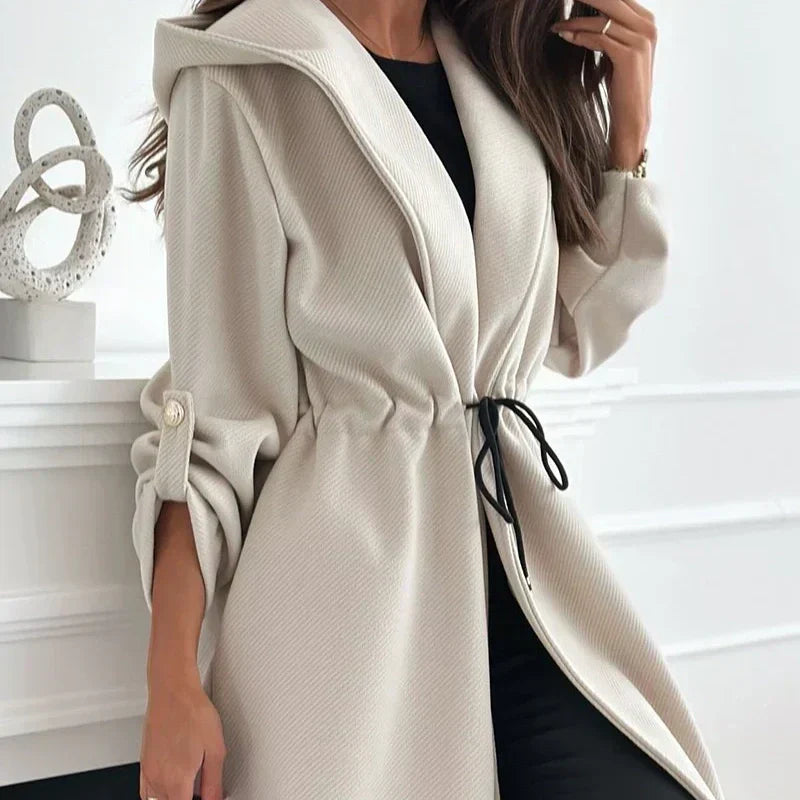Trendiger langer Mantel mit Kapuze und Krawatte für Frauen